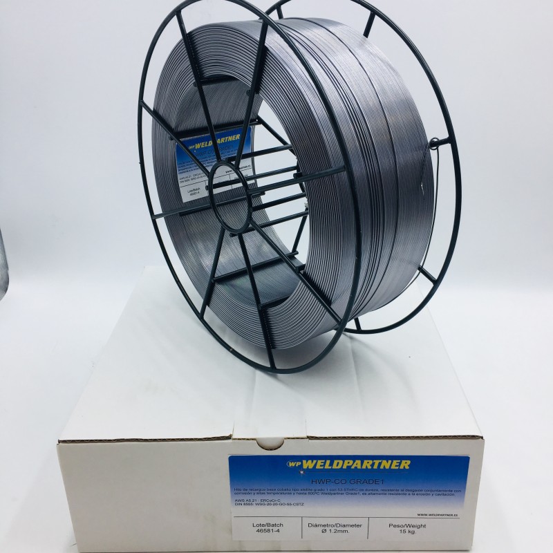 Hilo de recargue base cobalto tipo stellite grado 1 con 53-57HRC de dureza, resistente al desgaste conjuntamente con corrosión y altas temperaturas y hasta 800ºC. Weldpartner Grade1, es altamente resistente a la erosión y cavitación.