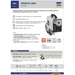 El equipo de soldar PROGYS 180A es un equipo MMA inverter de alta potencia para profesionales en mantenimiento industrial, construcción o taller. Con un manejo cómodo gracias a su mango superior, este equipo es ultra compacto y ligero (5,1 kg) y ofrece excelente dinámica de arco y soldadura de todos los electrodos de acero inoxidable, hierro fundido y rutilos en corriente continua hasta Ø 4 mm. Con características como Hot Start, Anti Sticking y Arc Force, este equipo garantiza una excelente fusión y calidad de soldadura. Además, es probado contra sobre tensiones hasta 400V y es compatible con el uso en grupo electrógeno gracias a su tecnología Protec 400. Incluye maletín, cable de masa (1,60 m.- 16 mm²) y portaelectrodos (2 m. - 16 mm²).